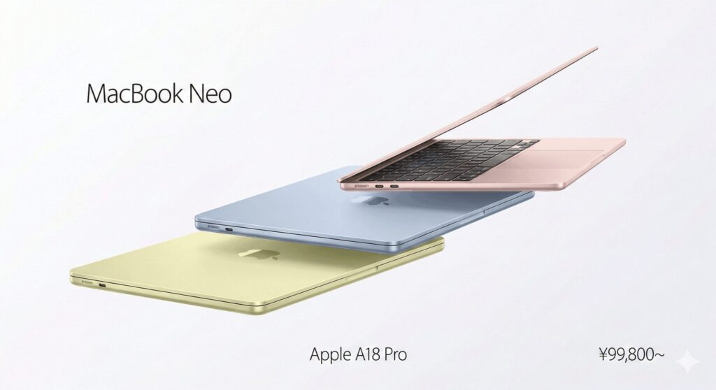 MacBook Neoは2026年3月に突如として発表されました。最大のニュースは、Macとして初めてiPhone向けの「Aシリーズ」チップ、具体的にはA18 Proを採用したことです。