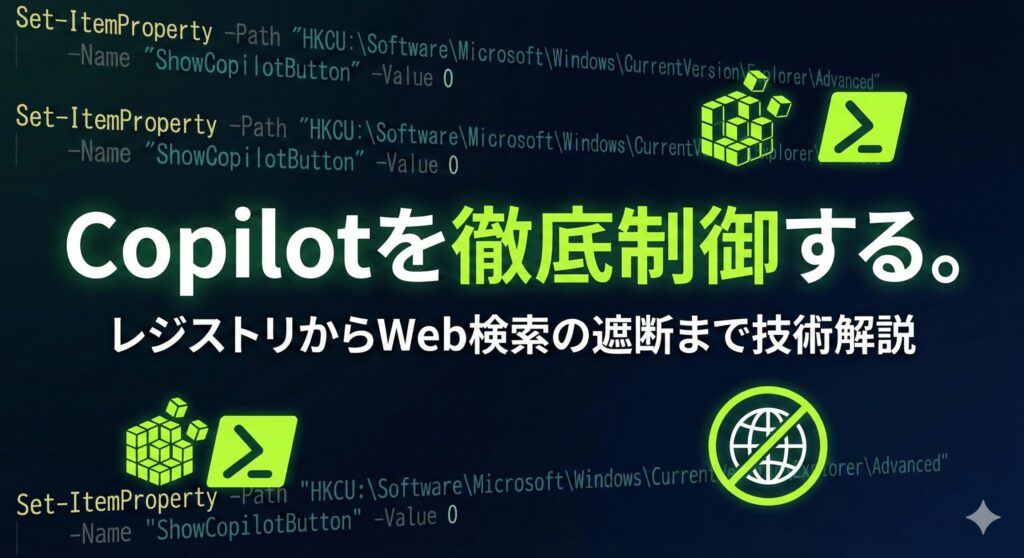 Home版のWindowsを使っていてグループポリシーが使えない場合や、スクリプトで一気に設定を流し込みたい時はレジストリを操作します。特定のキー(TurnOffWindowsCopilotなど)を追加して値を「1」にすることで、システムレベルで機能を黙らせることが可能です。