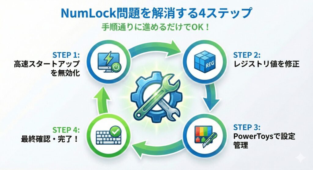 解決への近道は、まず「.DEFAULT」と「CURRENT_USER」の両方のレジストリ値を合わせること、そして必要に応じて高速スタートアップをオフにすることを試してみてください。これで大抵のケースは解決するはずです。テンキー付きキーボードを使っている方にとっては死活問題ですから、しっかり設定しておきたいですね。