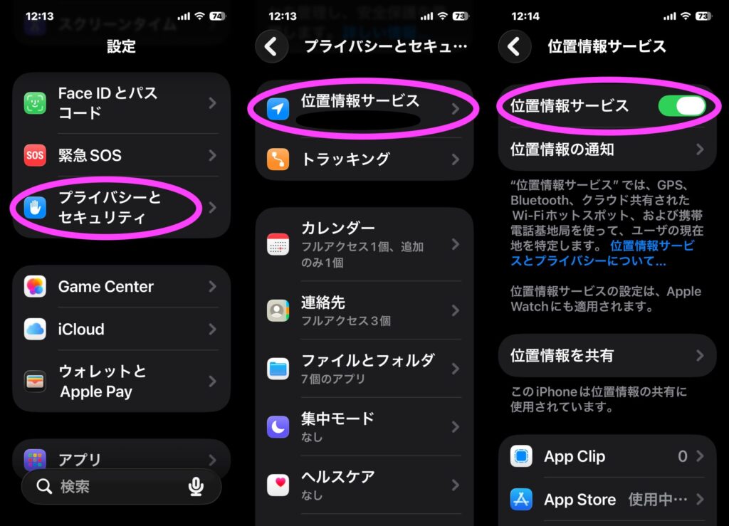- 位置情報サービスがオフだと、衛星の案内が出にくい