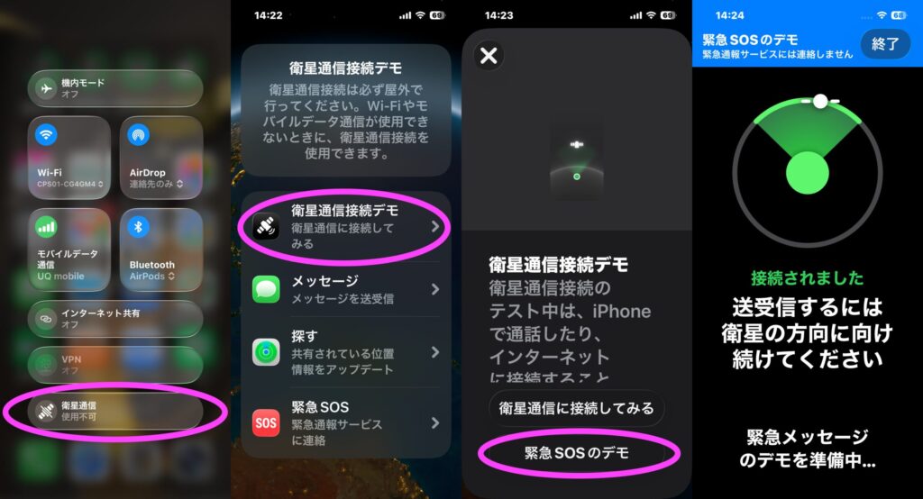緊急SOSは人命に関わる機能なので、本番でいきなり触るのは怖いですよね。そこで役立つのが衛星通信接続デモです。これは実際に救助要請を送らず、操作感を練習できるモードです。