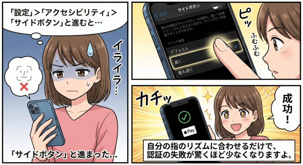「設定」>「アクセシビリティ」>「サイドボタン」と進むと、クリック速度を「デフォルト」「遅く」「最も遅く」から選べます。自分の指のリズムに合わせるだけで、認証の失敗が驚くほど少なくなりますよ。