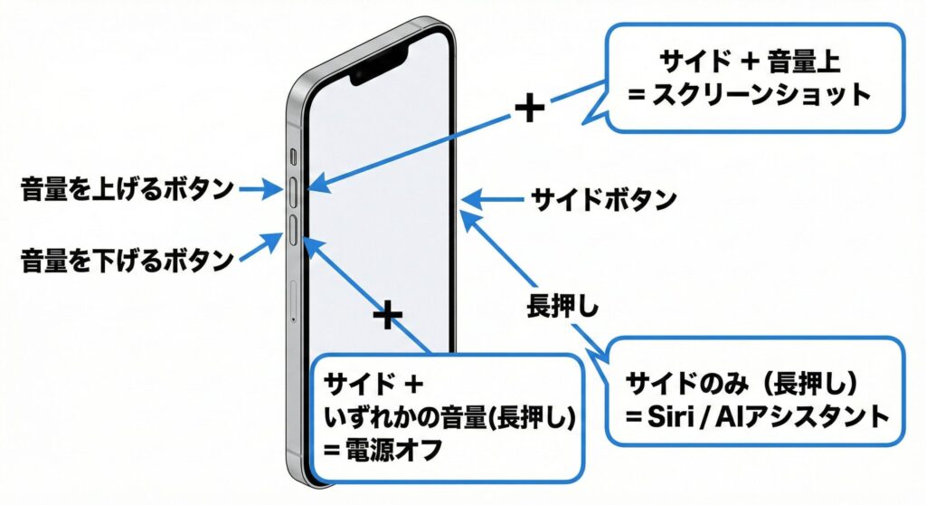 iPhone 17でスクリーンショットを撮る基本の動作は、「サイドボタン」と「音量を上げるボタン」を同時に一瞬だけ押すというものです。長押ししすぎると電源オフのメニューが出てしまうので、カチッと短く押すのがコツかなと思います。