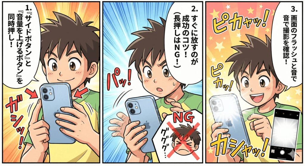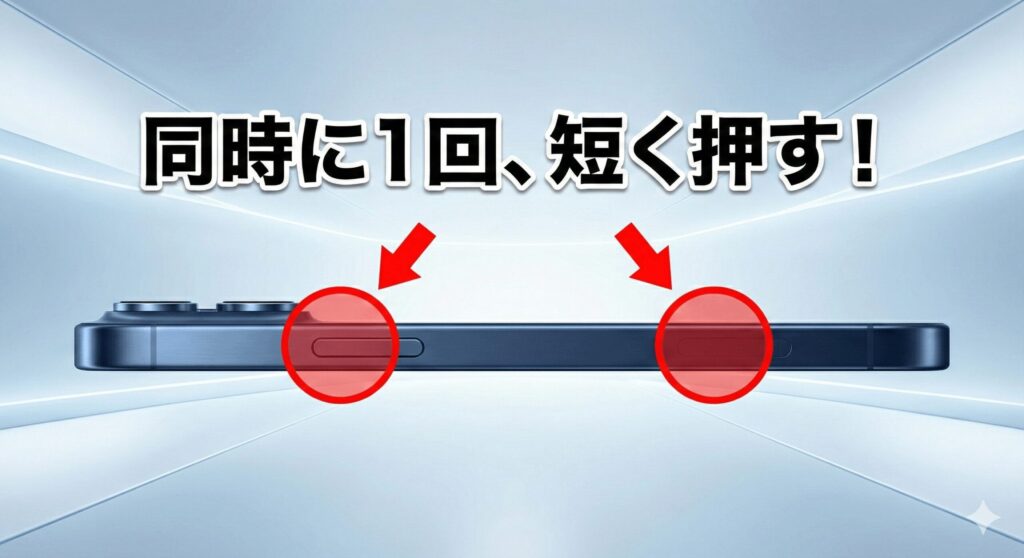 iPhone 17シリーズで最もスタンダードな撮影方法は、本体右側のサイドボタンと、左側の音量を上げるボタンを同時に押して、すぐに放すという手順です。ここでのポイントは、「ボタンを長押ししないこと」です。0.5秒以上押し続けてしまうと、電源オフのメニューや緊急通報の画面が出てきてしまうので、リズムよく「ポチッ」とクリックする感覚で操作してくださいね。