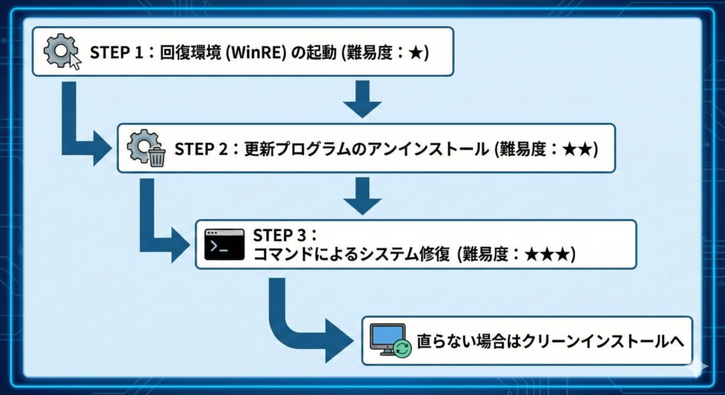原因がわかったところで、次は具体的な復旧作業に入ります。基本的には「負担の少ない方法」から順番に試していくのが鉄則です。焦ってクリーンインストールする前に、以下のステップを確認してみてください。