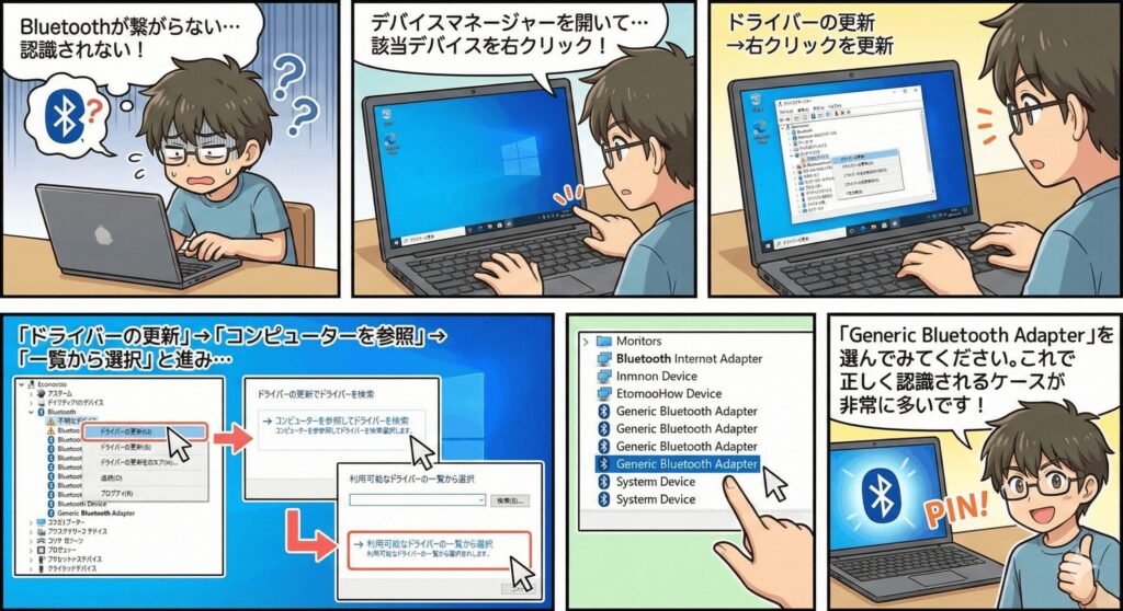 解決策として有効なのが、汎用ドライバーへの差し替えです。デバイスマネージャーを開き、該当のデバイスを右クリックして「ドライバーの更新」→「コンピューターを参照してドライバーを検索」→「利用可能なドライバーの一覧から選択」と進み、「Generic Bluetooth Adapter」を選んでみてください。これで正しく認識されるケースが非常に多いです。