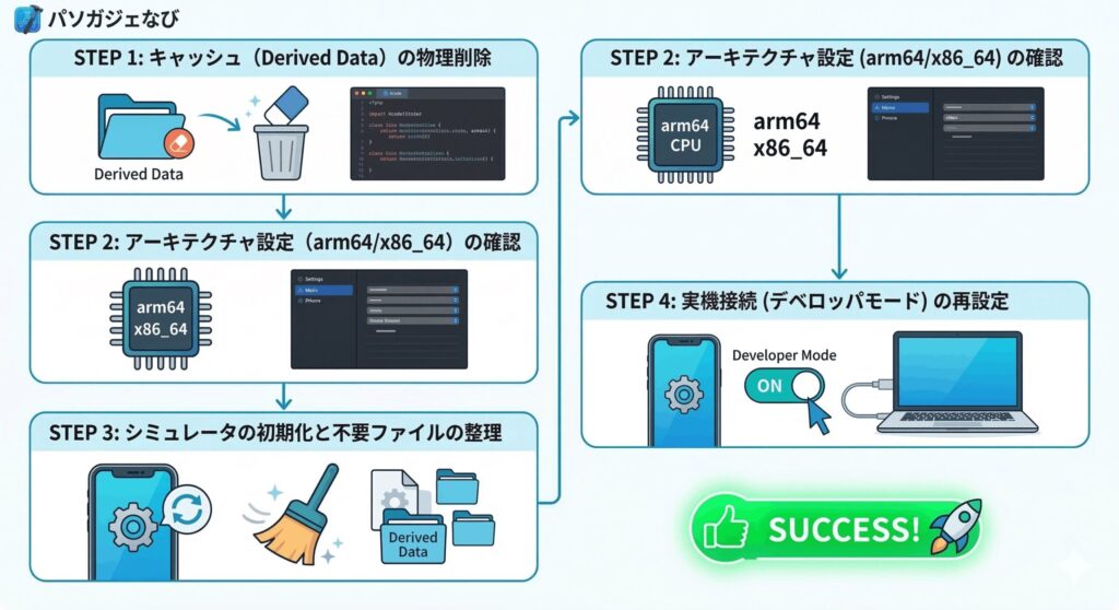 ターミナルから rm -rf ~/Library/Developer/Xcode/DerivedData/* を実行すれば、ゴミを一度に一掃できます。これだけでエラーが嘘のように消えることがよくあるので、困った時の第一選択肢にしてくださいね。