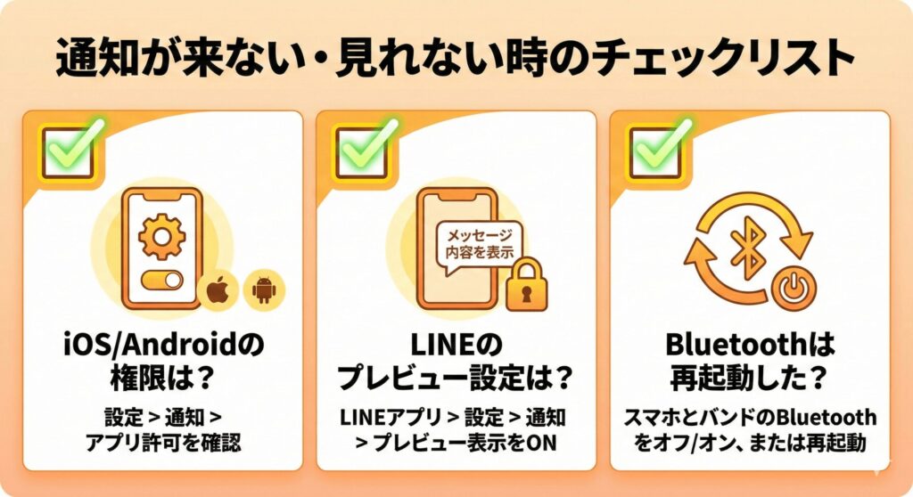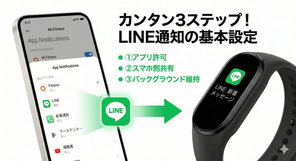まずは基本中の基本、LINE通知をバンド側に飛ばすための設定から見ていきましょう。ここがズレていると、どれだけ本体をいじっても通知は届きません。デバイスとアプリ、両方の橋渡しをしっかり作ってあげることが大切です。